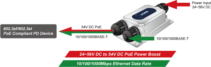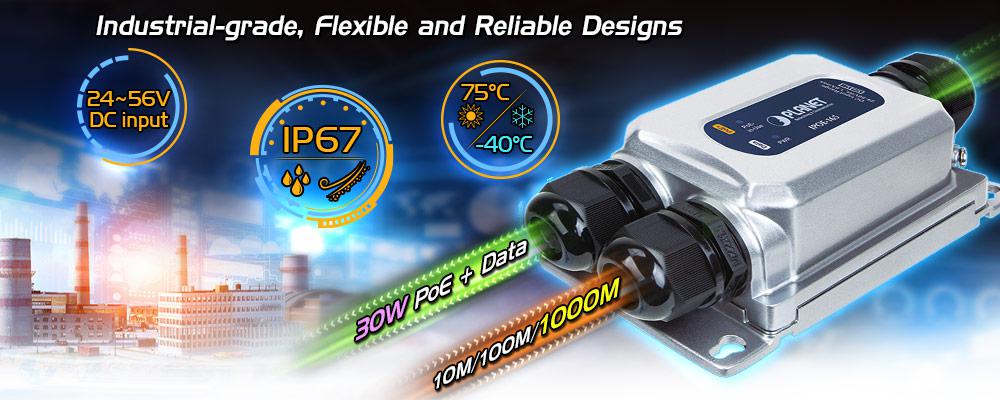 Industrial Single-Port PoE Injector PLANET IPOE-165 đầu ra một cổng 802.3at PoE+ được xếp hạng IP67 cung cấp tối đa 30 watt cho mỗi cổng đầu ra PoE, truyền cả dữ liệu Gigabit Ethernet và nguồn 802.3at PoE qua cáp UTP. Nó được thiết kế đặc biệt cho các thiết bị được cấp nguồn ngoài trời (PD) như camera mạng PTZ, camera vòm tốc độ PTZ, điểm truy cập mạng Wifi AP (11a / b / g / n) và các thiết bị mạng khác cần công suất cao hơn để hoạt động ổn định .