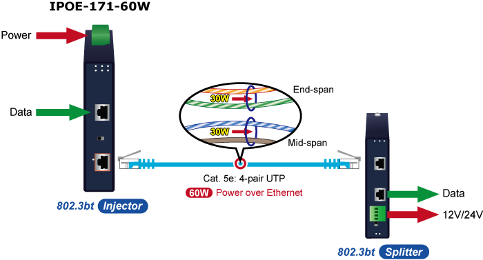 IPOE-171-60W cung cấp khả năng để tạo ra nguồn điện lên đến 60 watt bằng cách sử dụng tất cả bốn cặp Cat tiêu chuẩn 5e / 6.