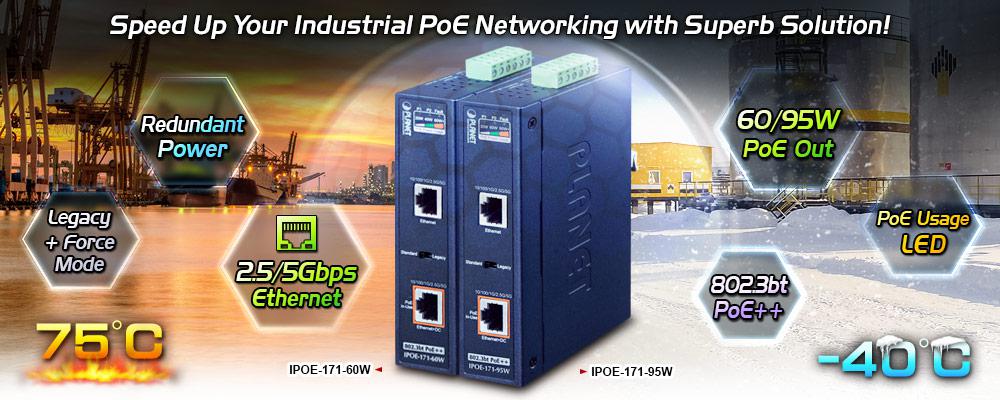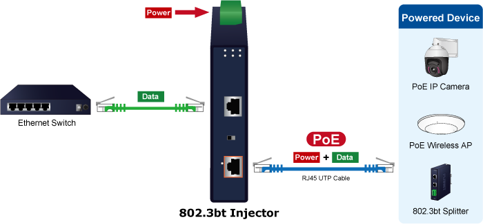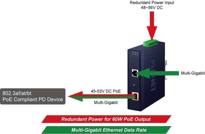 Các tính năng chính Industrial Single-Port Multi-Gigabit PoE++ 802.3bt Injector PLANET IPOE-171-60W