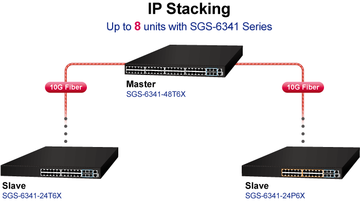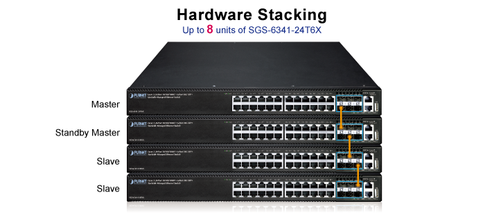 | Stacking Management | Supports IP Stacking and Hardware Stacking 8 members max. 2 software-defined ports function as Stacking Up and Down interfaces Note: The firmware version of each switch must be identical. |