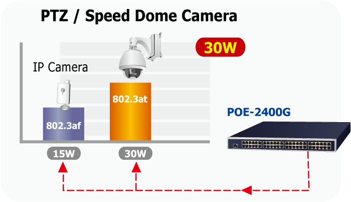 Nguồn PoE in-line áp dụng tiêu chuẩn IEEE 802.3at Power over Ethernet Plus giúp POE-2400G có thể cung cấp nguồn điện trên mỗi cổng lên đến 36 watt cho mỗi PD tương thích PoE từ xa. Nó sở hữu khả năng cấp điện gấp đôi so với 802.3af PoE thông thường và là giải pháp lý tưởng để đáp ứng nhu cầu ngày càng tăng về các PD mạng tiêu thụ điện năng cao hơn, chẳng hạn như PTZ (xoay, nghiêng và thu phóng), camera mạng tốc độ vòm, màn hình cảm ứng màu hoặc điện thoại video và thoại qua IP (VoIP), điểm truy cập mạng LAN không dây 802.11ac đa kênh và các thiết bị mạng khác.