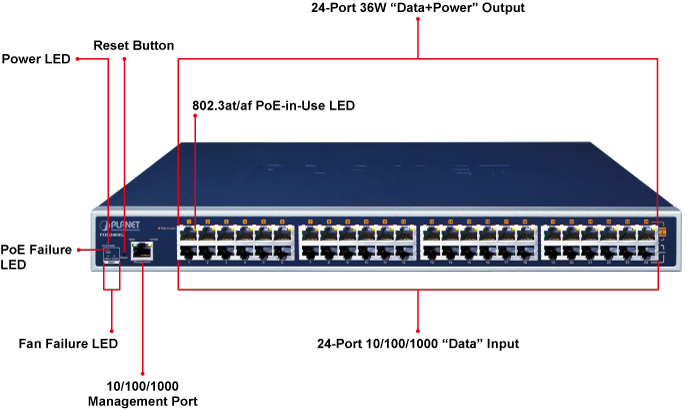 Managed PoE Injector Hub POE-2400G được cài đặt giữa Bộ chuyển mạch Ethernet thông thường và các PD. Có tổng cộng 48 cổng RJ45 STP trên bảng điều khiển phía trước của POE-2400G, trong đó 24 cổng ở ngăn xếp phía dưới có chức năng là ” Đầu vào dữ liệu ” trong khi 24 cổng khác ở ngăn xếp phía trên có chức năng là ” PoE (Dữ liệu và Công suất) đầu ra ”. Cả nguồn và dữ liệu được truyền đồng thời qua cáp UTP đến PD mà không ảnh hưởng đến hiệu suất và chức năng mạng hiện có.