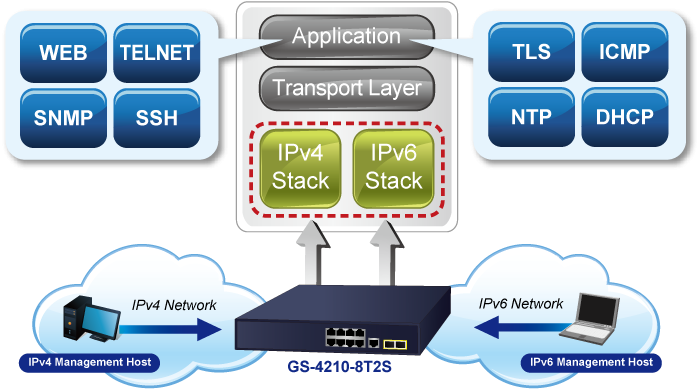 Hơn nữa, GS-4210-8T2S cung cấp khả năng quản lý từ xa an toàn bằng cách hỗ trợ các kết nối SSHv2, TLSv1.2 và SNMP v3 mã hóa nội dung gói tại mỗi phiên.