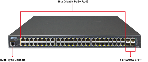 • 48 cổng đồng 10/100 / 1000BASE-T Gigabit RJ45 với 48 cổng IEEE 802.3af / at PoE + chức năng phun