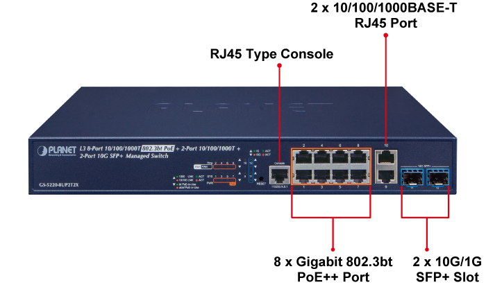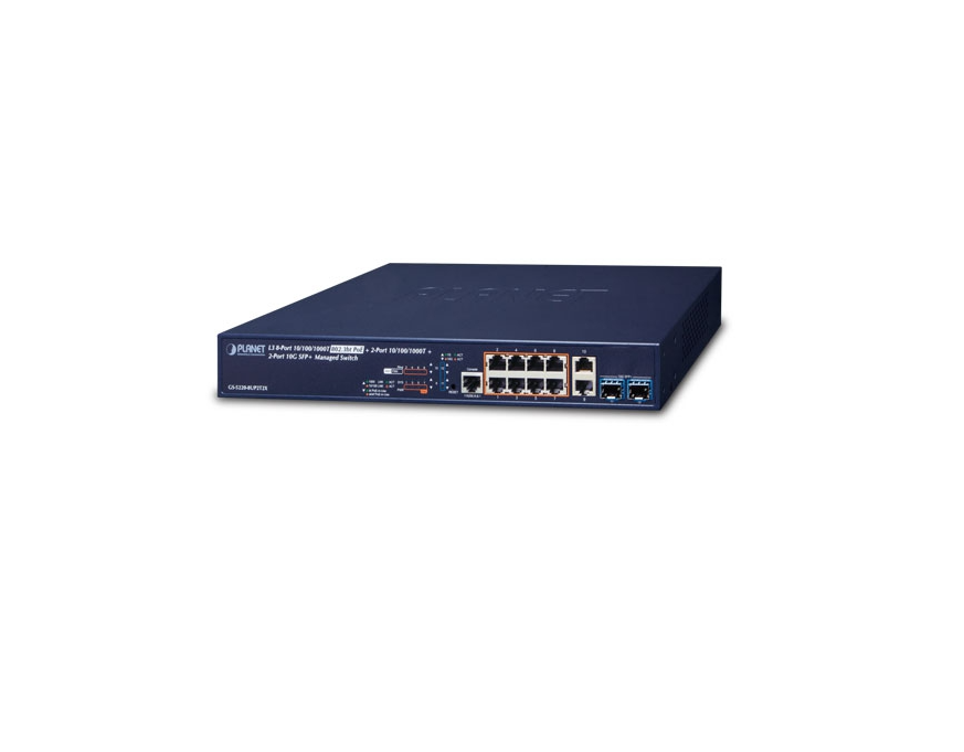 L3 Managed Switch PoE PLANET GS-5220-8UP2T2X, Layer 3 8-Port 10/100/1000T 802.3bt PoE + 2-Port 10/100/1000T + 2-Port 10G SFP+