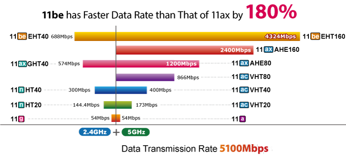 - Tốc độ lên đến 5100 Mbps (khoảng 689 Mbps ở tần số 2,4 GHz và 4324 Mbps ở tần số 5 GHz) với mã hóa 4K‑QAM (4096‑QAM) để tăng cường thông lượng