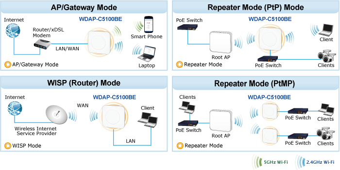 - Chế độ hoạt động linh hoạt (AP, Gateway và Repeater) cho nhiều nhu cầu triển khai khác nhau