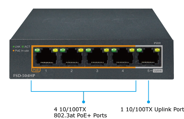 Tính Năng Chính Switch 5-Port 10/100Mbps với 4-Port PoE PLANET FSD-504HP